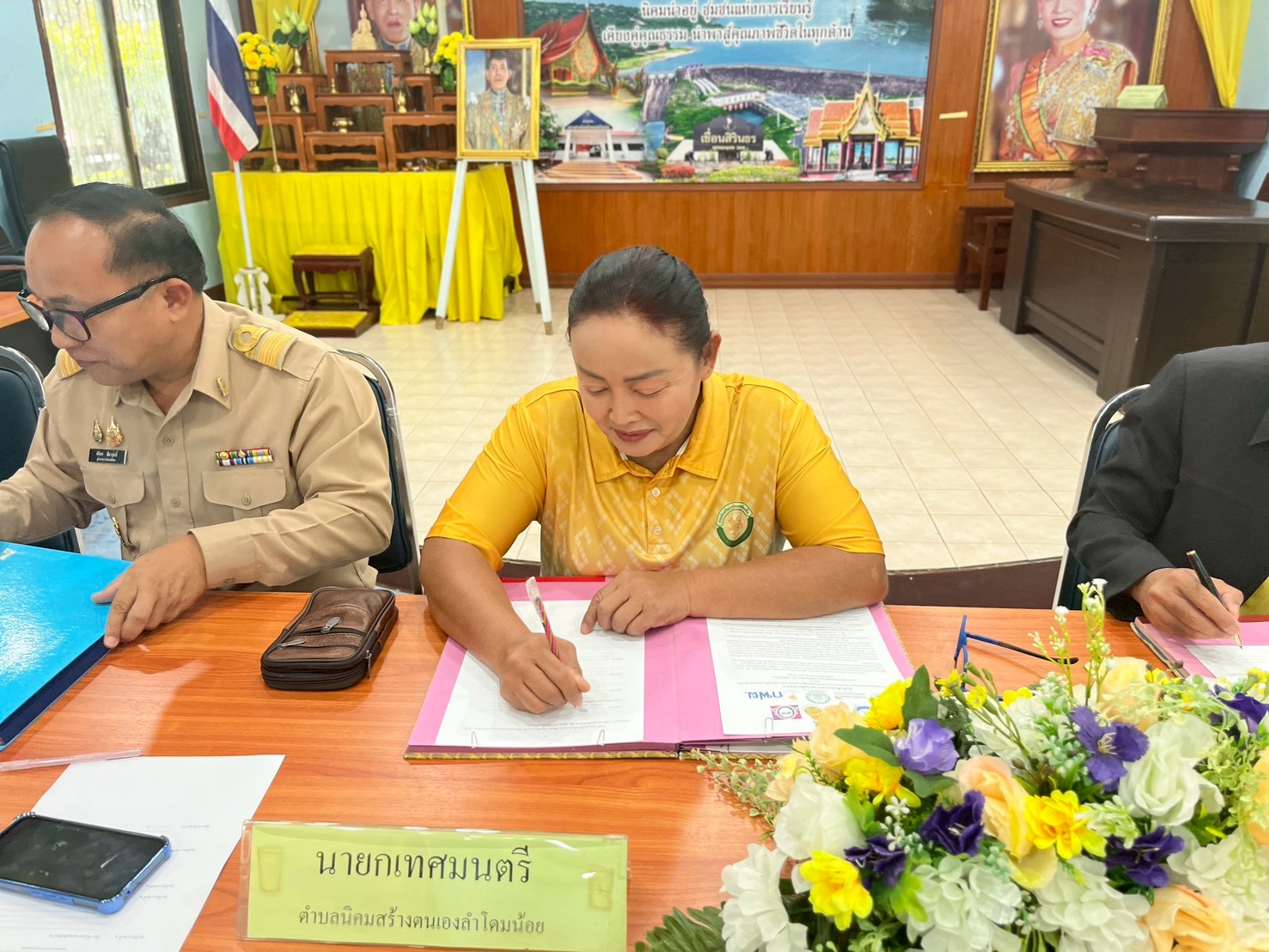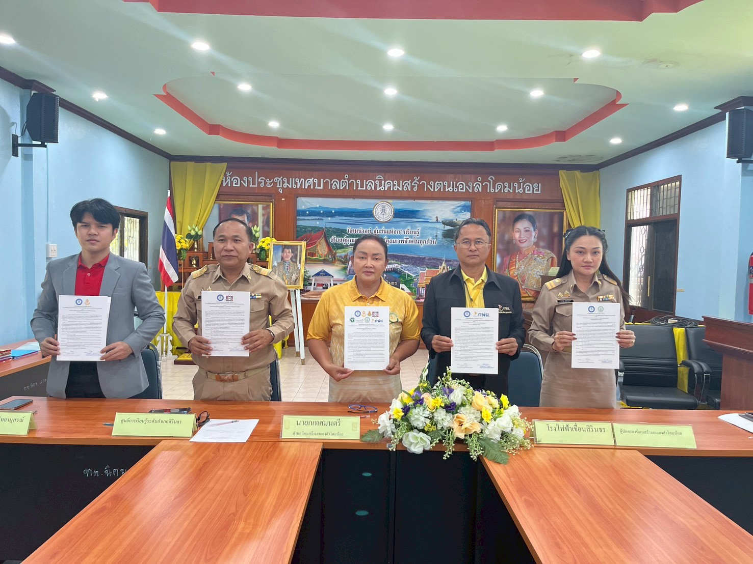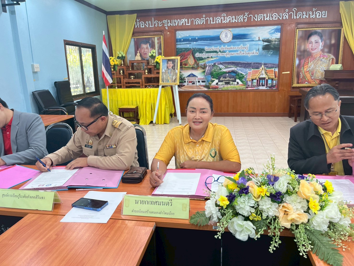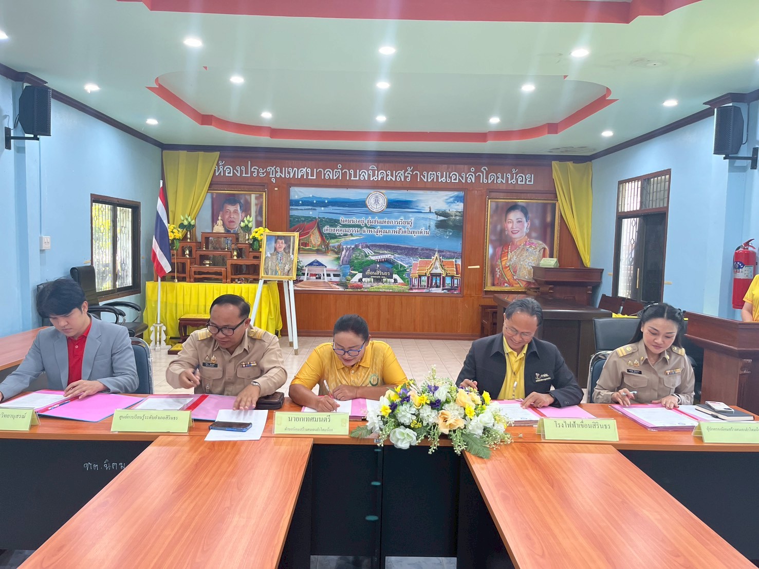 ประชุมร่วมลงนามบันทึกข้อตกลงความร่วมมือ (MOU) ในการขับเคลื่อนและสนับสนุนการดำเนินงานโครงการโรงเรียนผู้สูงอายุเทศบาลตำบลนิคมสร้างตนเองลำโดมน้อย ระหว่างเทศบาลตำบลนิคมสร้างตนเองลำโดมน้อย กับ ภาคีเครือข่าย